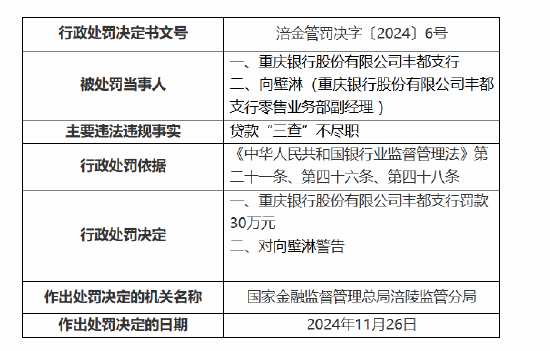 11月29日金融一线消息,国家金融监督管理总局涪陵监管分局行政处罚信息公开表显示,重庆银行股份有限公司丰都支行因贷款“三查”不尽职,被罚款30万元。