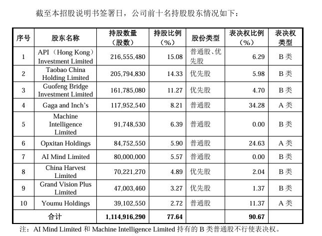 招股书显示,蚂蚁集团及阿里巴巴分别通过旗下子公司API(Hong Kong)Investment Limited 和Taobao China Holding Limited ,间接持有旷视15.08%、14.33%股份,是第一大、第二大股东。