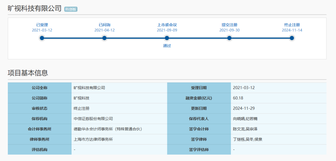 12月3日,源媒汇查询上交所官网发现,昔日AI四小龙之一的旷视,IPO状态已显示为“终止注册”。此次IPO终止,是旷视及其主承销商中信证券主动要求撤回科创板上市注册申请,原因是“基于对技术趋势、行业环境和自身战略选择的全面考量”。