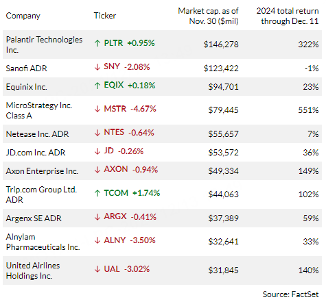Palantir Technologies (PLTR) tops the list with a market cap of $146 billion after its shares have more than quadrupled this year. The company is newly eligible for the Nasdaq-100 as it switched over to the Nasdaq from the New York Stock Exchange toward the end of November. At the time it announced the planned switch of its exchange, Palantir said it anticipated Nasdaq-100 inclusion, and shares popped.