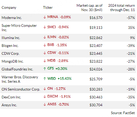 To see which companies might be added to the Nasdaq-100 Index or removed from it for this year's reconstitution, we looked at combined market capitalizations for all publicly traded common share classes for the entire Nasdaq Composite Index as of Nov. 30, as calculated by FactSet. Then we removed companies in financial-services industries and sorted the remaining list by market cap.