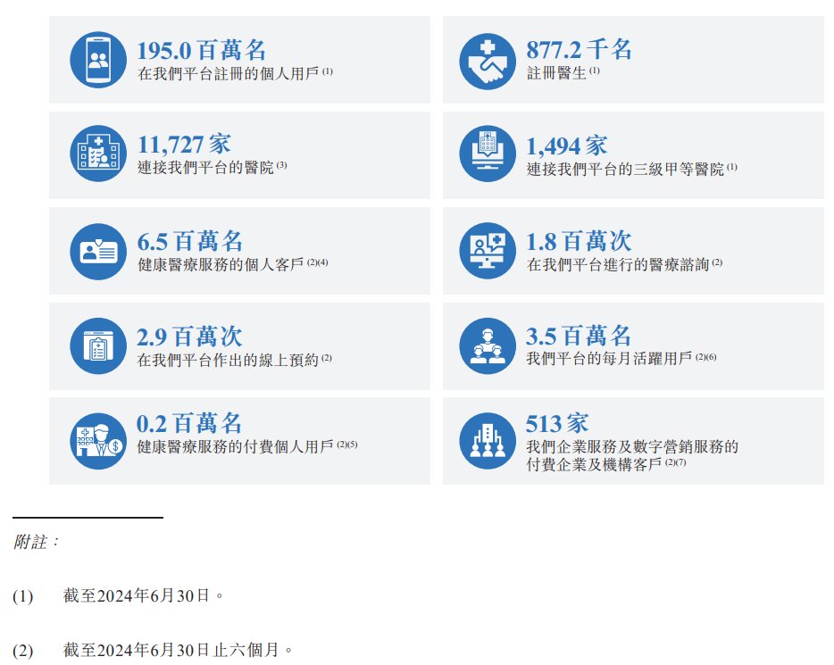 据招股书披露,健康之路于中国经营数字健康医疗服务平台。根据弗若斯特沙利文的资料,按截至2023年12月31日平台上的注册个人用户数目来计算,公司是第四大数字健康医疗服务平台。根据弗若斯特沙利文的资料,按2023年的收入来计算,健康之路亦是第五大数字健康医疗服务平台,市场份额低于5%。自2001年起,公司便为中国个人用户于数字平台上提供健康医疗服务。于2015年,开始为企业及机构提供企业服务及数字营销服务。