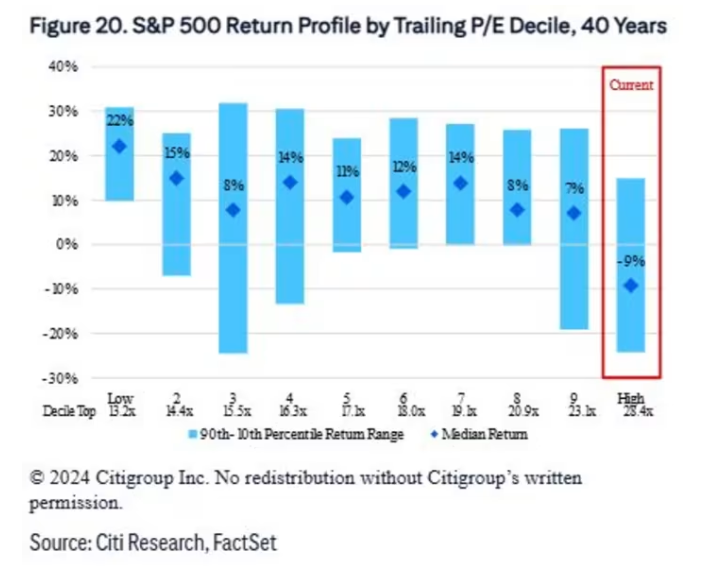 花旗将注意力集中在对2025年的估值担忧上。Chronert和他的同事说,“美股的市盈率目前处于历史最高的十分位数(在一组数据从小到大排列后位于前十分之一位置的数值) ,这是过去40年估值达到如此高位时唯一一次的风险回报为负。在这种情况下,中位数回报率往往为负数,潜在的下行亏损大于上行收益。”