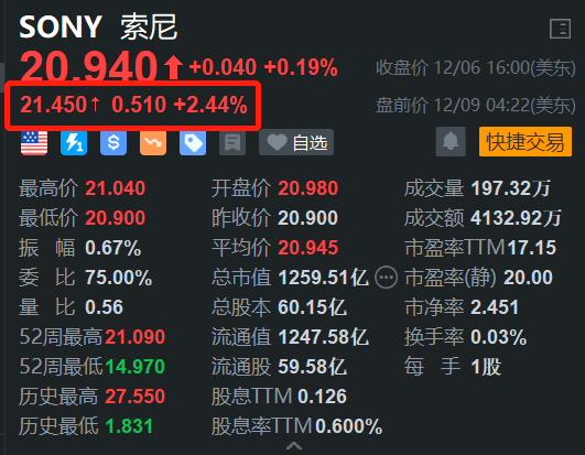 美股异动|索尼盘前涨2.4% 消息称公司为苹果头显提供VR手柄