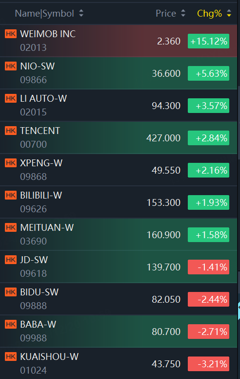Nio rose 5.6%; Li Auto rose 3.6%; Kuaishou fell 3%, Alibaba, Baidu fell over 2%.