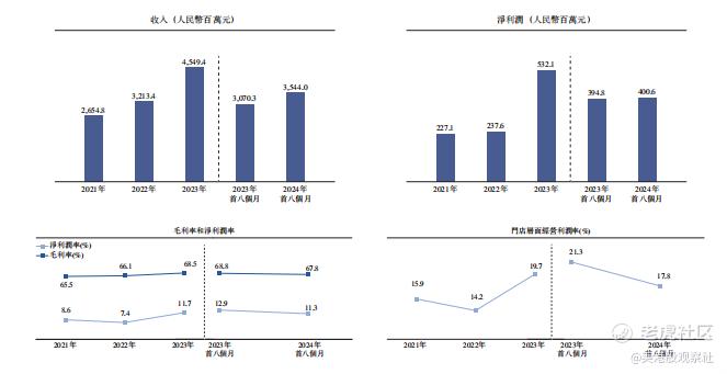 2021 年至 2023 年,公司毛利率分别为 65.5%、66.1% 和 68.5%,截至 2024 年 8 月 31 日止八个月为 67.8%,整体保持相对稳定。净利率方面,2021 年至 2023 年净利率分别为 8.6%、7.4% 和 11.7%,截至 2024 年 8 月 31 日止八个月为 11.3%。2023 年净利率大幅提升主要得益于收入增长、成本控制以及疫情后市场需求的恢复。公司通过优化供应链管理、提高运营效率等措施,有效控制了成本,使得毛利率和净利率保持在较高水平,在大众便民中式餐饮市场中具有较强的盈利能力。