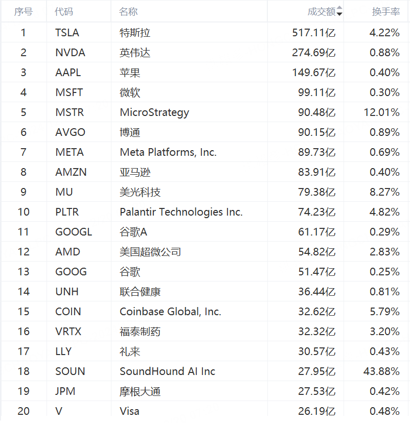 第5名 MicroStrategy 收跌6.63%,成交89.93亿美元。美东时间周四尾盘,比特币下跌4.27%,失守96000美元/枚。微策略公司是比特币持仓大户,该公司周二称,如有必要,公司将制定新的比特币采购计划。