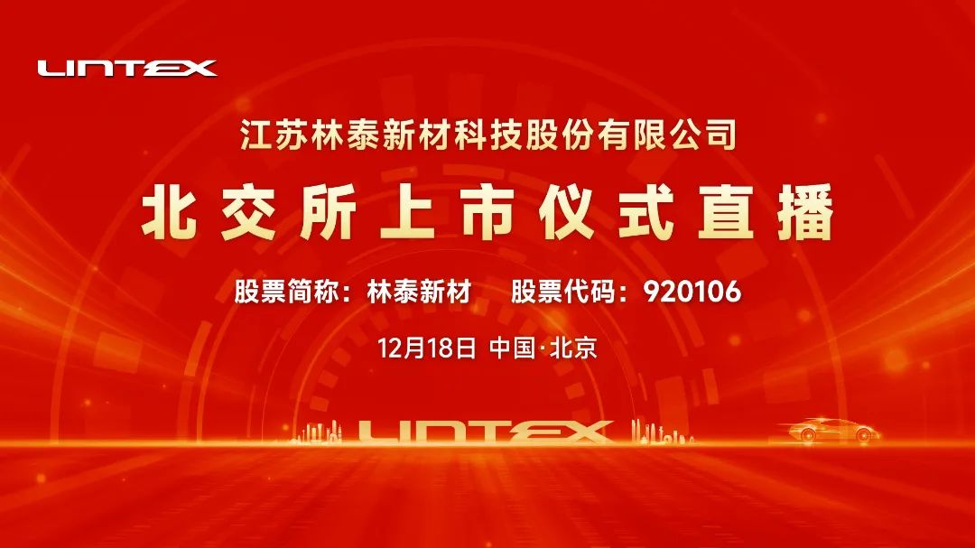 江苏林泰新材科技股份有限公司成立于2015 年,是一家专业从事汽车自动变速器摩擦片研发、生产和销售的专精特新企业,主要产品为自动变速器湿式纸基摩擦片和对偶片,应用于包括液力自动变速器(AT)、无级变速器(CVT)、双离合器变速器(DCT)、混合动力专用变速器(DHT)和纯电动汽车专用变速器(DET)等在内的主流汽车自动变速器中。林泰新材将于2024年12月18日登陆北交所上市交易,全景路演将对上市仪式全程直播,敬请关注。