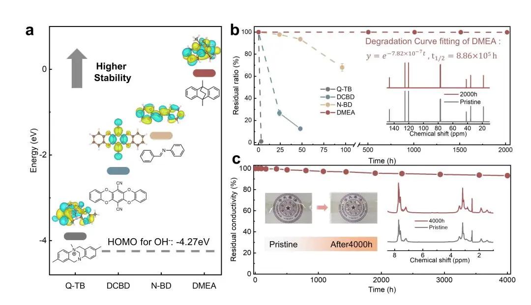 图4.模型分子及HFM-AEMs的稳定性测试。(a-b)模型分子的LUMO模拟值及实际降解曲线;(c) HFM-AEM-3耐碱稳定性测试。