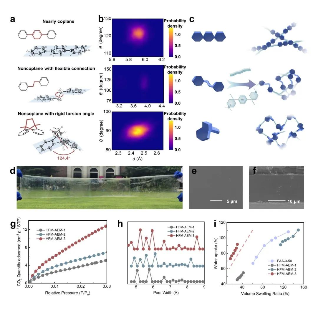 图2. HFM-AEMs的设计、制备与表征。(a)对三联苯、1,2-二苯乙烷和DMEA的单晶XRD;(b)不同芳香单体的键长d与键角θ的联合概率密度分布;(c)芳香单体结构对聚合物链延伸与堆叠方式的影响示意图;(d)HFM-AEMs的放大生产(宽幅0.3m);(e-f) HFM-AEM-3的SEM图像;(g-h)HFM-AEMs的CO₂吸附曲线及孔径分布;(i)HFM-AEMs吸水率和体积溶胀率。