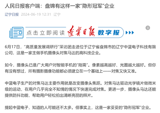 2023年7月,中蓝电子被《人民日报》头版头条点名,充分肯定了公司在科技创新、产业发展中的突出贡献,当时这篇报道透露公司通过12年潜心发展,已成为国家专精特新“小巨人”企业,拥有近1500项专利。2024年6月,辽宁日报又转载人民日报的文章,介绍中蓝电子是盘锦的“隐形冠军”企业。