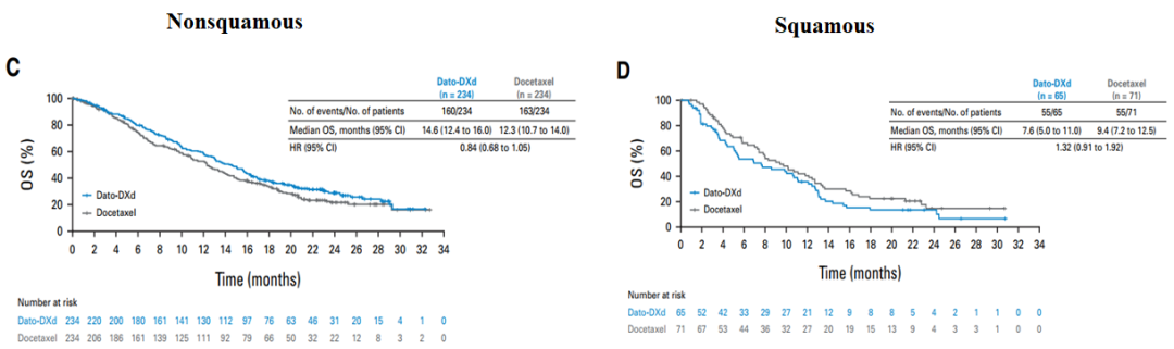 该临床研究共有299名患者和305名患者分别被随机分配接受Dato-DXd或多西他赛治疗。Dato-DXd组的中位无进展生存期(PFS)为4.4个月(95% CI, 4.2至5.6),多西他赛组为3.7个月(95% CI, 2.9至4.2)(危险比 [HR], 0.75 [95% CI, 0.62至0.91];P = 0.004)。中位总生存期(OS)分别为12.9个月(95% CI, 11.0至13.9)和11.8个月(95% CI, 10.1至12.8)(HR, 0.94 [95% CI, 0.78至1.14];P = 0.530)。未达到统计学意义。