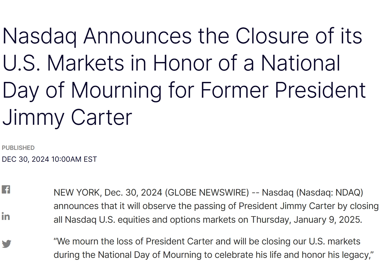 纽交所总裁林恩·马丁在声明中表示:“纽约证券交易所将通过在全国哀悼日暂停交易,向卡特总统毕生为国家服务的贡献致以敬意。”
