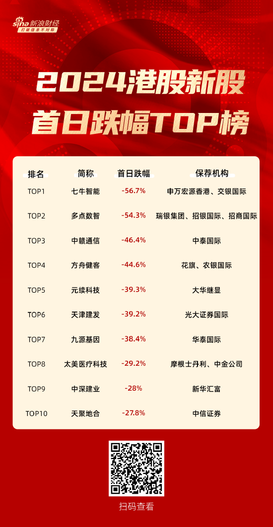 2024港股新股首日跌幅TOP10:七牛智能跌超56%摘得“桂冠” 申万宏源香港、交银国际保荐