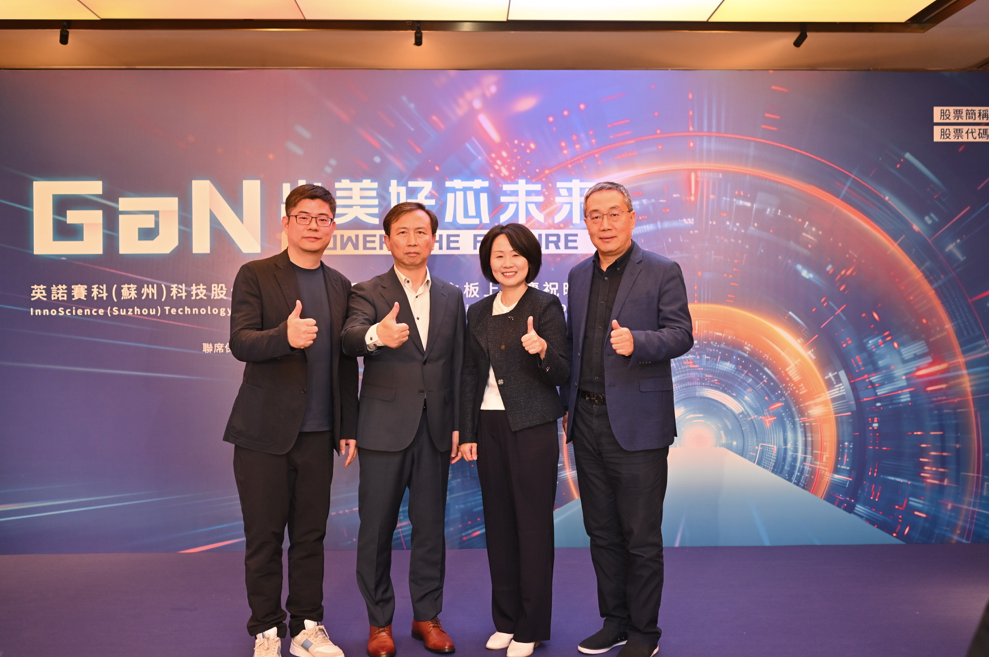 从左往右依次为:华业天成创始合伙人杨华君、英诺赛科CEO吴金刚、英诺赛科创始人兼董事长骆薇薇、华业天成创始合伙人孙业林