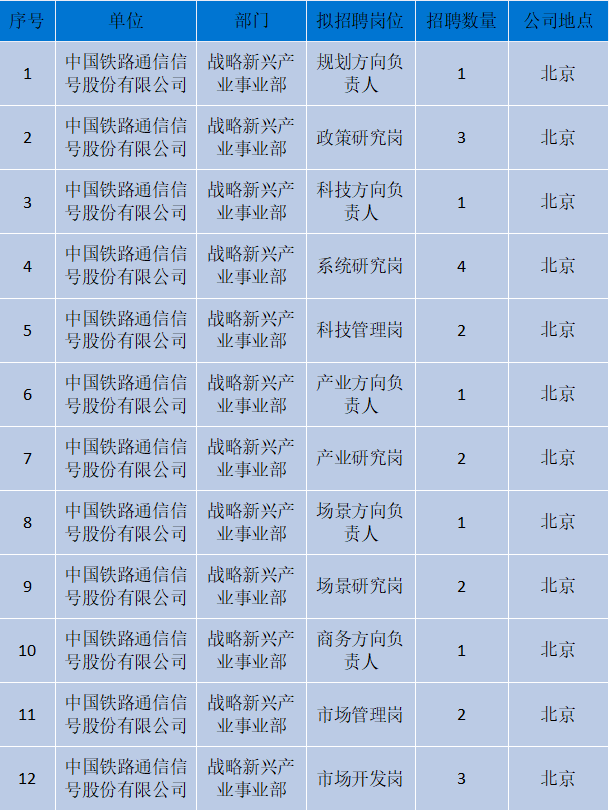根据工作需要,现向全社会范围内公开招聘中国铁路通信信号股份有限公司战略新兴产业事业部相关工作人员,具体情况如下: