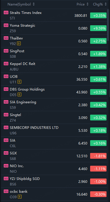 The Straits Times Index (STI), a key benchmark for the Singapore Exchange, ranged between 3,780.46 and 3,800.81 throughout the day. It ended the session at 3,800.81, up 13.21 points or 0.35% compared to Tuesday's close.