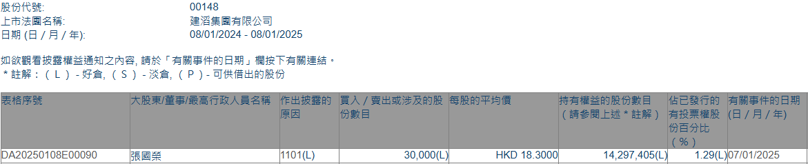 香港联交所最新资料显示,1月7日,董事会主席张国荣增持建滔集团(00148)3万股,每股作价18.3港元,总金额为54.9万港元。增持后最新持股数目约为1429.74万股,最新持股比例为1.29%。