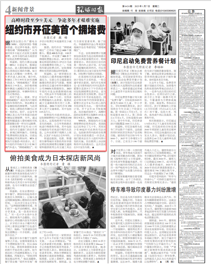 据美国全国公共广播电台(NPR)、《纽约时报》等媒体报道,经过多年准备,纽约市曼哈顿“拥堵减缓区”从当地时间5日起正式征收交通拥堵费。此举令纽约成为美国首个征收此类费用的城市。