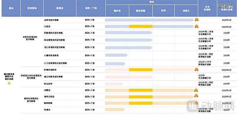 除了这款核心产品,在2022-2023年期间,脑动极光又先后获批基本认知能力测验软件、认知功能辅助筛查评估软件和阅读障碍辅助筛查管理软件。根据招股书,这三款产品正在商业化过程中,预计2025年下半年全面商业化。其认知功能障碍治疗软件也已在2022年获得欧盟CE认证,计划在2026年实现商业化。