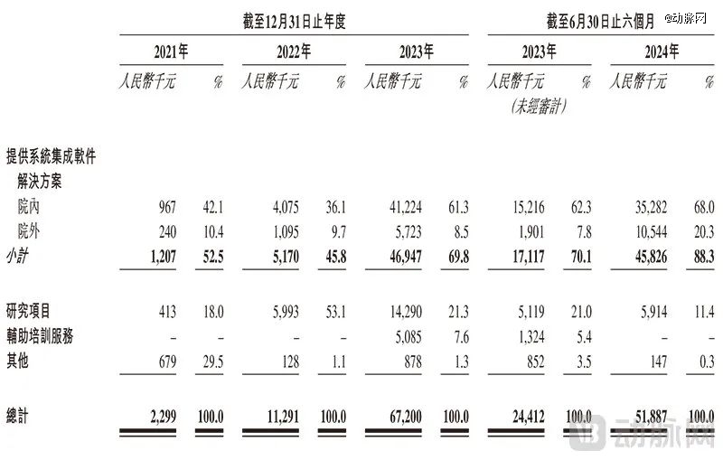 2023年,系统集成软件项目的收入占比已经达到了69.8%,明显与其他项目拉开了差距。到了2024年上半年,这一占比持续攀升至88.3%。尤其值得一提的是,其数字疗法在院外的销售占比在2024年似乎实现了突破,从以往长期不到10%的占比一举达到20.3%。