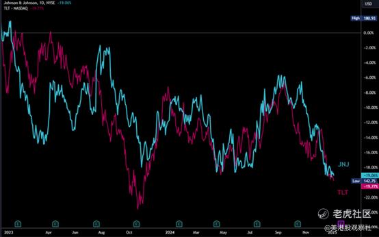 摩根大通谈到“债券代理行业”,在过去两年中,强生表现得像一只债券代理股票,与iShares 20+ Year Treasury Bond ETF(TLT)有密切的相关性。