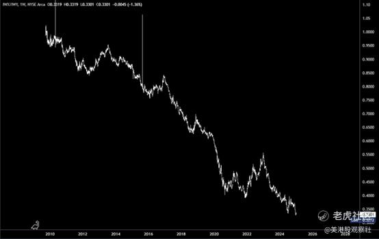 自全球金融危机以来,市场一直在追逐增长而非价值。有多种方式可以说明这一点,但iShares Russell Top 200 Value ETF除以iShares Russell Top 200 Growth ETF是一个可靠的图表,因为前者持有强生作为其第六大持仓,而后者持有七巨头。