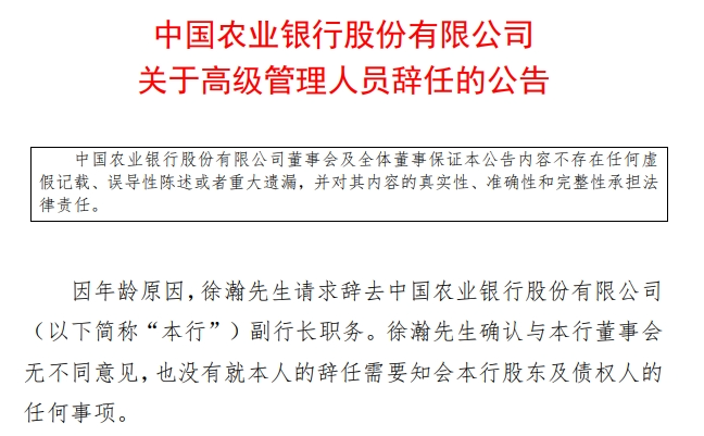 相关公告显示,因年龄原因,徐瀚请求辞去农行副行长职务。公告中,农行董事会对徐瀚任职期间做出的重大贡献表示衷心感谢。