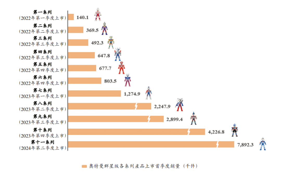 截至目前,布鲁可的奥特曼群星版已经推出13个系列,其中第十一系列于今年第二季度上市,首季度销量为789.23万,相比第十系列有86.7%的增长。