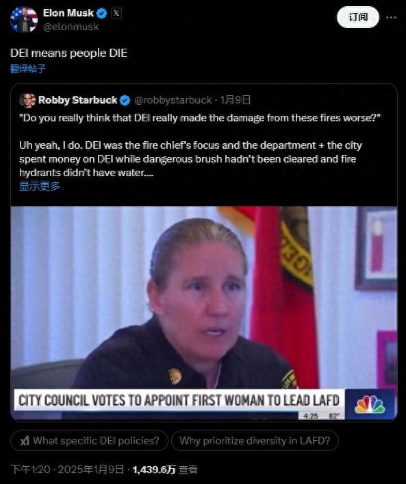 报道称,马斯克在X上发布多条帖文,是试图将消防部门的DEI政策实施与野火蔓延相关联的“主力军”。他转发了抨击洛杉矶消防局局长克里斯汀·克劳利(Kristin Crowley)的帖文,并写道“DEI意味着人们会死(DIE)”。