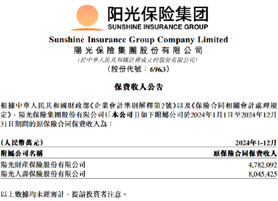 1月17日金融一线消息,阳光保险发布保费收入公告显示,2024年阳光财险原保险保费收入约478.21亿元,阳光人寿原保险保费收入约804.54亿元。