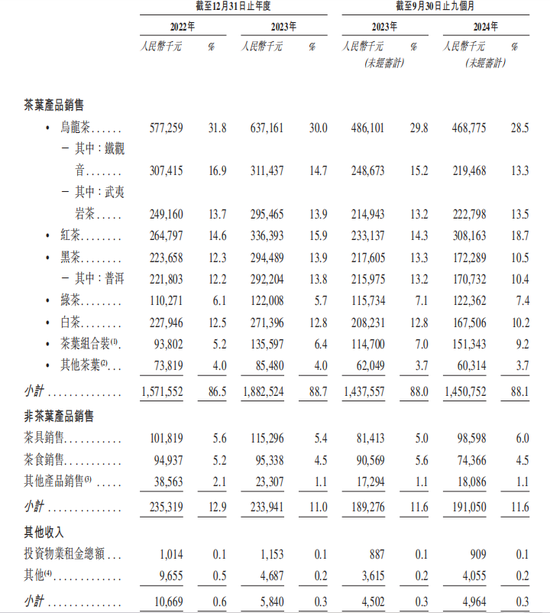 按产品划分,公司有茶叶产品、非茶叶产品、其他等三大板块。报告期内,茶叶产品为公司主要营收业务,占比维持在88%左右,非茶叶产品(包括茶具、茶食、纯茶饮料等)占比11%左右,其他收入(包括投资物业租金等)约占0.1%。