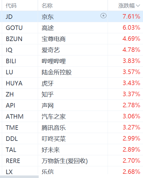 格隆汇1月17日|美股市场中概股集体上涨,纳斯达克中国金龙指数涨超2%。其中,京东涨超7%,高途涨6%,宝尊电商爱奇艺涨超4%,哔哩哔哩虎牙知乎汽车之家腾讯音乐涨超3%,好未来、叮咚买菜涨超2%。