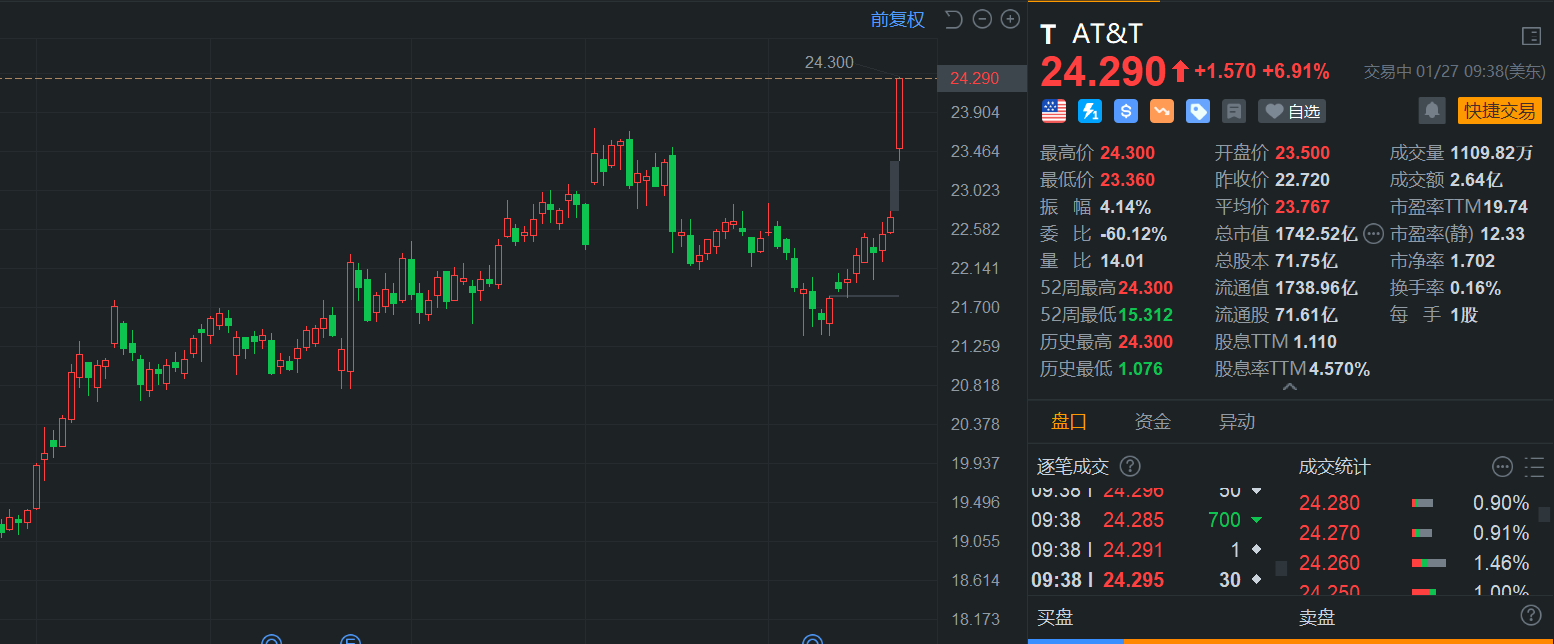 格隆汇1月27日|AT&T(T.US)盘初拉升涨近7%,报24.3美元创历史新高。数据显示,该公司第四季度营收为323亿美元,较去年同期增长1%,略高于华尔街的预期。该公司还报告称,每月新增移动用户48.2万,高于分析师预期的44.2万。在去年12月的投资者日上,AT&T 描绘了未来三年持续增长的美好前景,其中包括2027年收益实现两位数百分比增长。该公司重申了2025年不包括部分项目的每股收益为1.97美元至2.07美元的指引。(格隆汇)