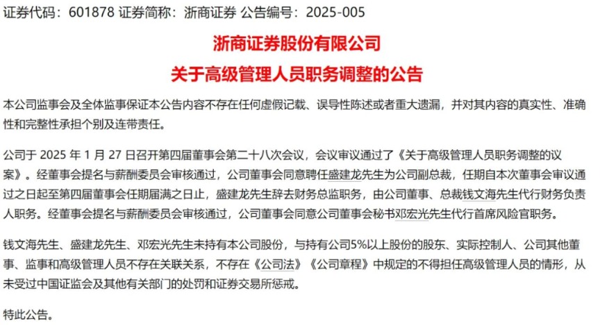 1月27日,浙商证券发布公告,由董事会秘书邓宏光接替张晖,代行首席风险官职务;由公司董事、总裁钱文海代行财务负责人职务;原财务总监盛建龙担任副总裁。