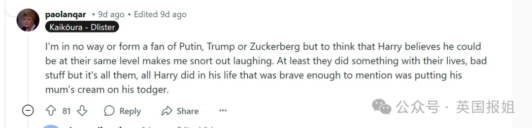“我完全不是大佬们的粉丝,但哈里竟然觉得自己能和他们平起平坐,真的让我笑出声。