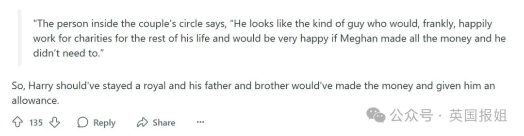 “所以哈里其实应该留在王室,他爸和他哥负责挣钱,然后给他发零花钱?”