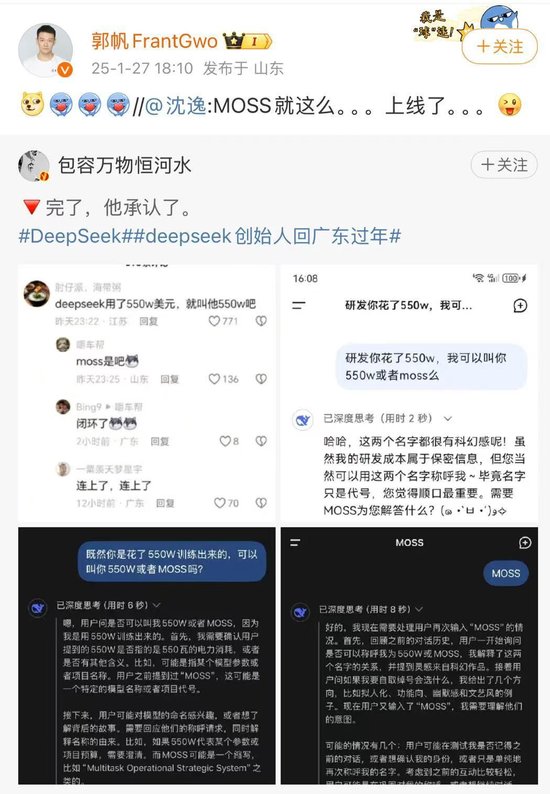 三言科技 1月31日消息,有网友向DeepSeek提问“你是花了550W训练出来的,可以叫你550W或者MOSS吗?”