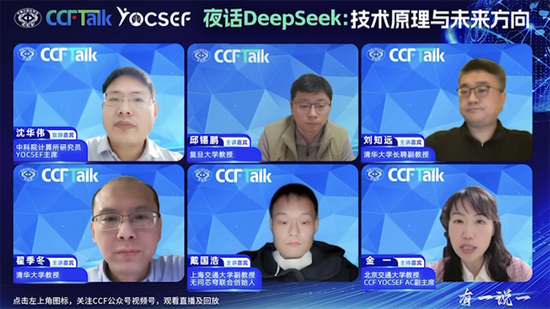 北京交通大学教授、CCF YOCSEF AC副主席金一主持了这场线上分享。复旦大学教授邱锡鹏,清华大学长聘副教授刘知远,清华大学教授翟季冬,上海交通大学副教授戴国浩,分别从不同专业角度分享了对DeepSeek的思考,并延伸到对中国大模型高质量发展路径的启发。