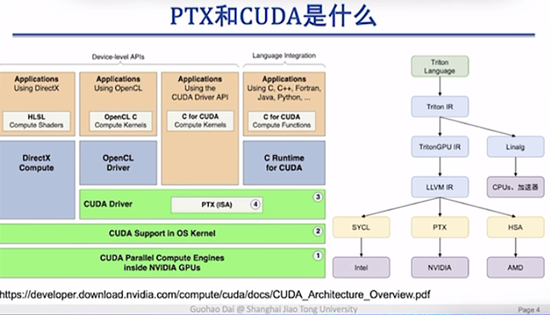 右边我们举了一个Triton的例子,也是OpenAI在主推的一个跨平台编程语言。它也是通过不断地编译和语言的转化,最终在调用底层英伟达硬件的时候,通过PTX code来调用的。所以简单来说,PTX的这一层是通过和硬件的直接交互,使得可以控制硬件更多的细节。