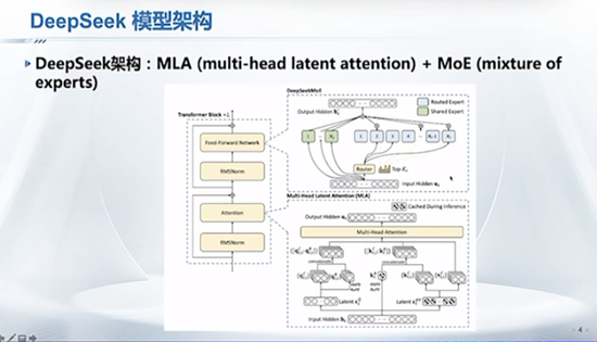 论文里给了DeepSeek模型架构图,核心是两块,MLA和MoE。MLA可以进一步降低推理消耗的内存。MoE包括共享专家和大量路由专家。
