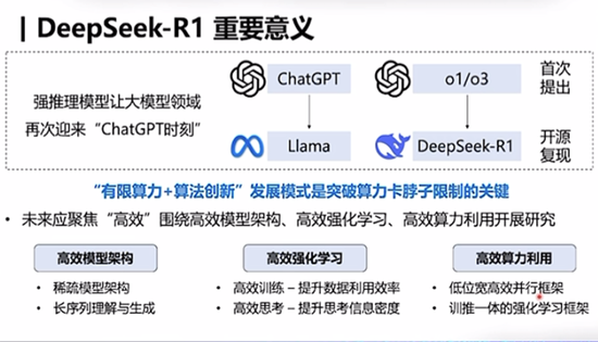 如果再进一步,把DeepSeek R1和前面发布的V3一起来考虑,它的重要意义在于,在有限算力资源支持下,通过强大的算法创新模式,突破了算力的“卡脖子”限制,让我们看到即使是在非常有限的算力下,我们仍然可以做出具有全球意义的这一些领先成果,这件事情对于我们中国AI的发展具有非常重要的意义。