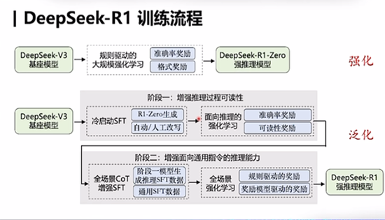 那具体是怎么做的呢?它分了两个阶段:第一阶段还是基于V3基座模型,通过增强推理过程的可读性,能够生成相当于是深度推理的SFT数据;第二阶段,它又去结合传统的通用SFT数据来微调大模型,再进一步进行强化学习,从而得到了一个具有非常强泛化能力的强推理模型,也就是R1。