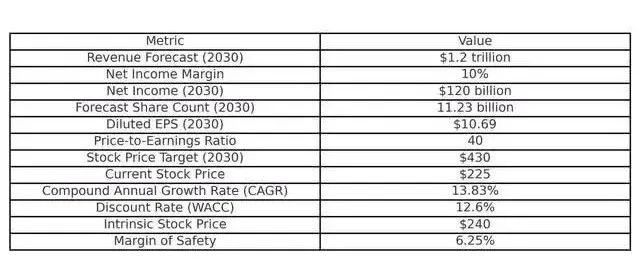 预测到 2030 年 1 月,该公司过去 12 个月的收入将达到 1.2 万亿美元,净利润率为 10%,自动化优势将为扩张提供巨大支持。预测结果是,到 2030 年 1 月,亚马逊的净收入估计为 1200 亿美元。