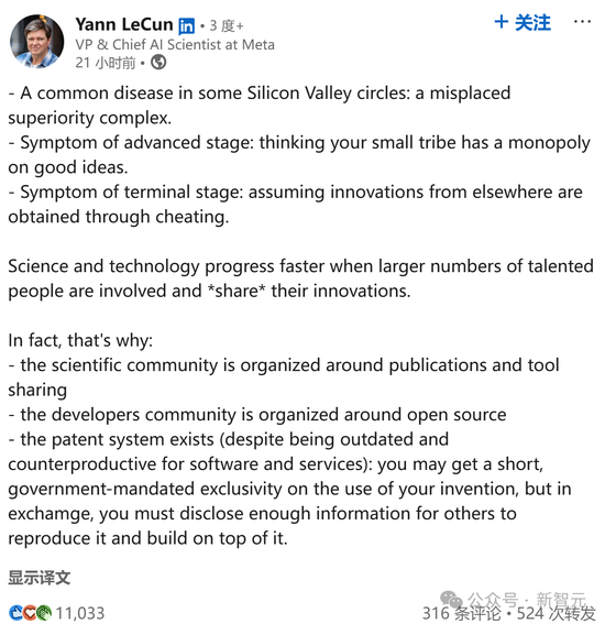 LeCun也发文指出,硅谷圈子的常见病,就是一种错位的优越感。