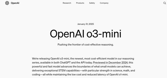 1月2日,OpenAI正式推出了全新推理模型o3-mini,并首次向免费用户开放推理模型。这是OpenAI推理系列中最新、成本效益最高的模型,OpenAI称该模型能够进行类似人类的推理。