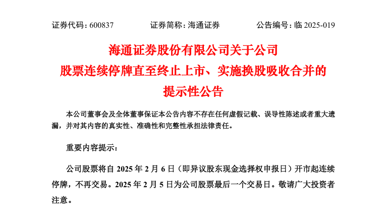 2月4日,海通证券发布公告,公司股票将至2月6日开市起连续停牌,不再交易。2025年2月5日为公司股票最后一个交易日。