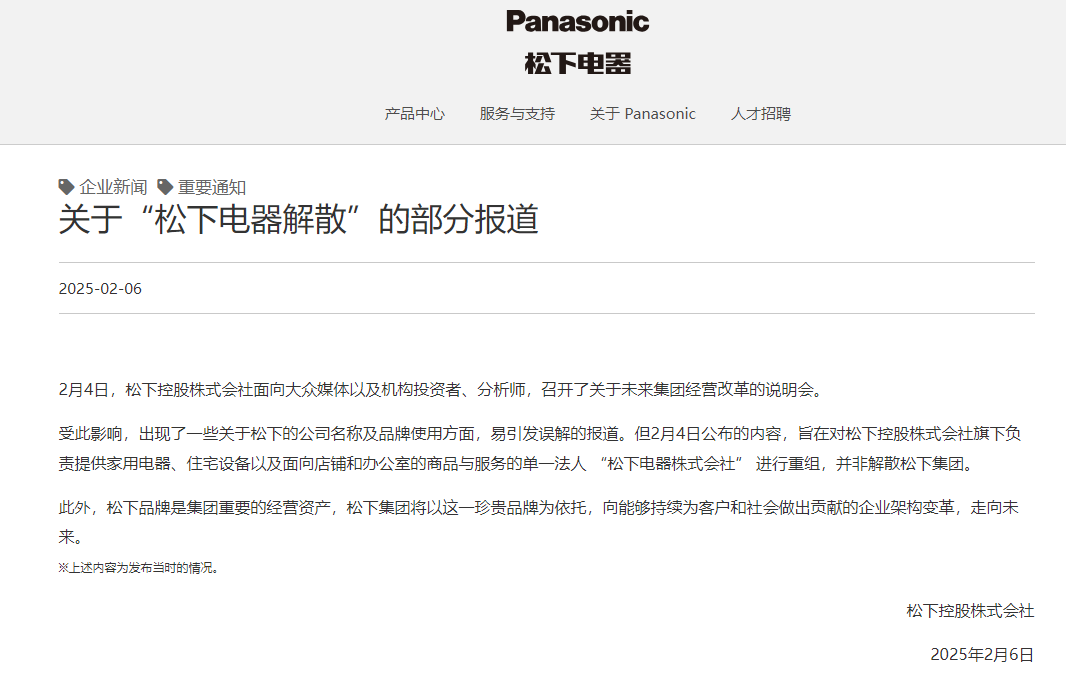 2月6日,松下电器官网发布两则声明(其二)此前,多家媒体称日本松下官宣解散家电子公司并放弃电视机业务,直言“世间将再无松下电视”。相关话题登上热搜,引发大批网友讨论。