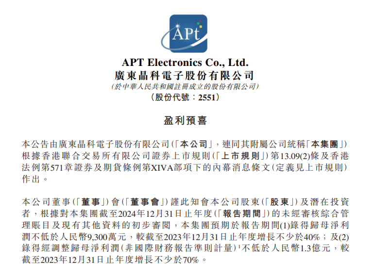 2月7日,晶科电子股份(02551.HK)发布公告,截至2024年12月31日止年度的未经审核综合管理账目及现有其他资料的初步审阅,集团预期于报告期间录得归母净利润不低于9300万元,较截至2023年12月31日止年度增长不少于40%;及录得经调整归母净利润(非国际财务报告准则计量)不低于1.3亿元,较截至2023年12月31日止年度增长不少于70%。