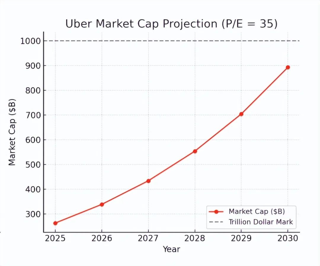 优步的净利润率目前约为 11%,预计未来几年这一比例将会上升。考虑到当前的利润走势、人工智能带来的潜在成本节约以及其他效率,这似乎相当合理。